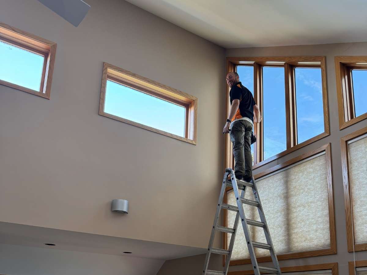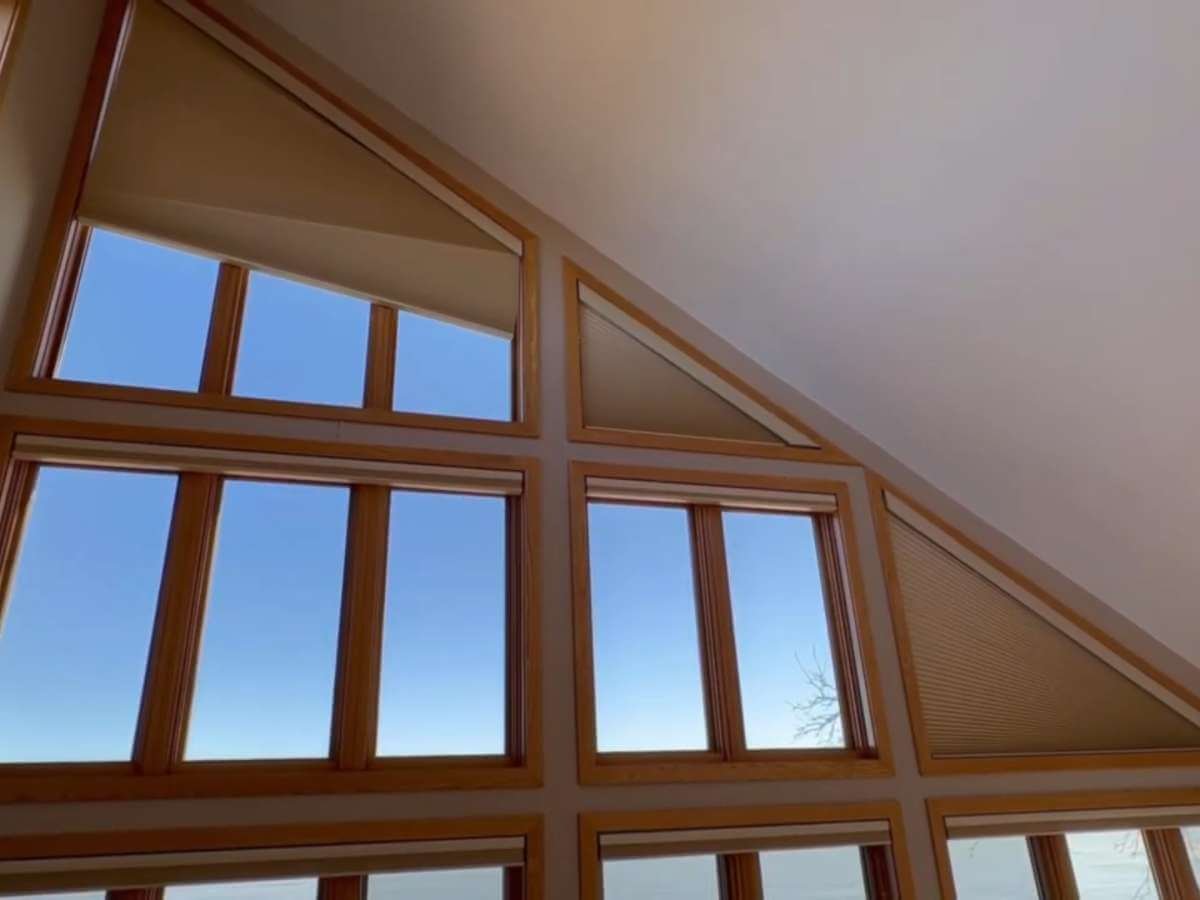 When our client moved into their new Madison home, they faced a significant challenge with their master bedroom’s impressive window wall. The second-floor bedroom featured soaring ceilings and a stunning array of specialty-shaped windows, including distinctive trapezoid windows that created an architectural statement. While beautiful, these east-facing windows created a practical nightmare – manual operation was impossible due to the height, and the morning sun made peaceful sleep elusive.