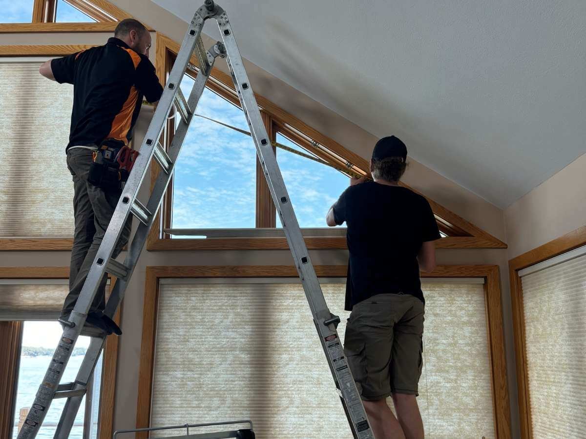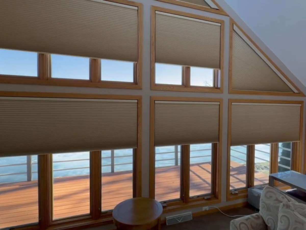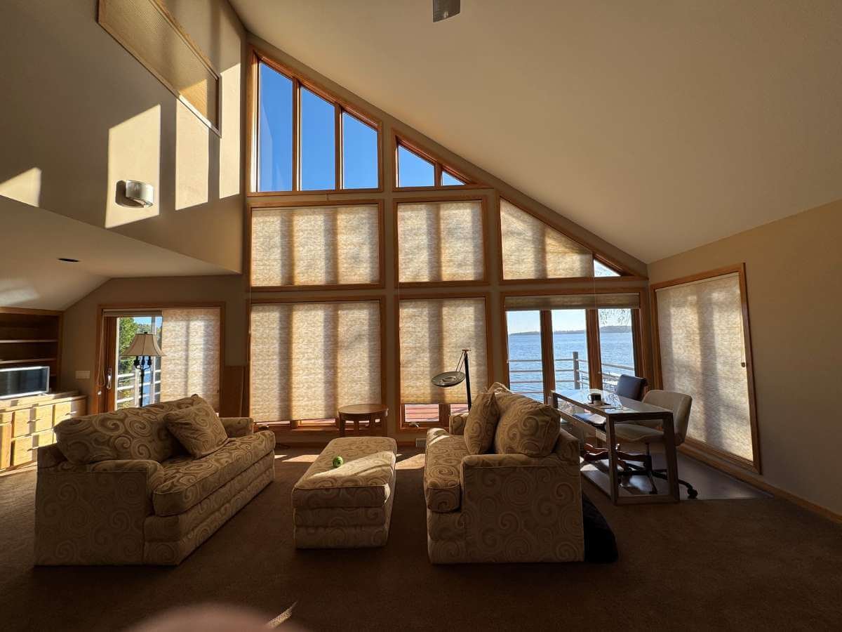 After consulting with our window treatment experts at Incredible Windows, we implemented a comprehensive solution using Hunter Douglas PowerView® Duette® Honeycomb Shades in room-darkening fabric. The installation encompassed three walls of windows, with special attention to the challenging lakeside window wall.